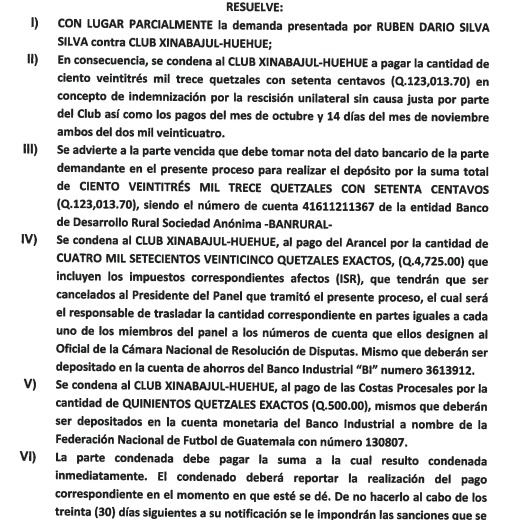 La Cámara de Resolución de Disputas (CNRD ) emitió la resolución definitiva sobre la demanda interpuesta por el portero Rubén Darío Silva a Xinabajul Huehue.